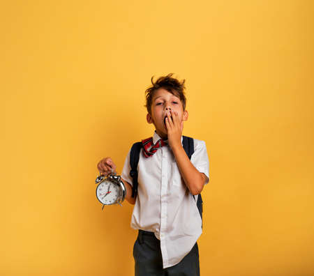Young child student with ringing alarm clock is lazy going to school. Yellow background
