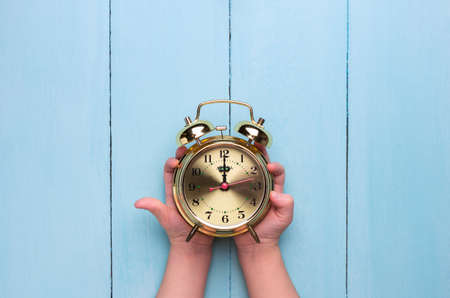 Golden alarm clock in children's hands on a light blue background. Time concept, top view, place for text.