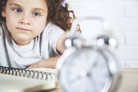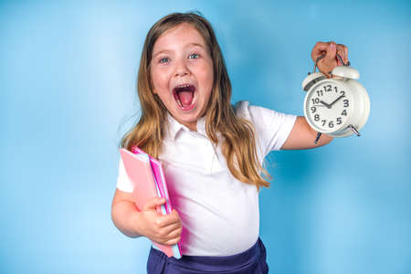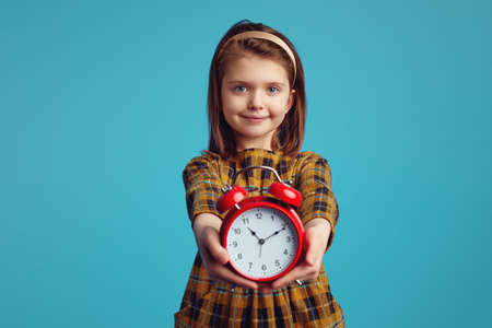 Punctual teen girl checking time. Child with alarm clock showing time. Happy girl face, positive and smiling emotions.