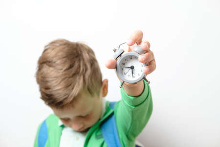 kid boy holding clock alarm, copy space. Time for school. Little student overslept.