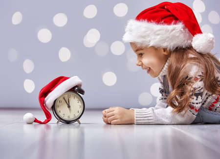 Christmas Eve! Cheerful child in a Christmas hat with alarm clock