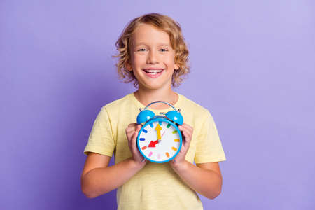 Photo of positive cheerful small boy hold clock show time isolated over violet color background