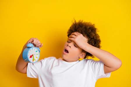 Yawning young boy holding a clock against yellow background, showing a tired expression and casual white t-shirt style