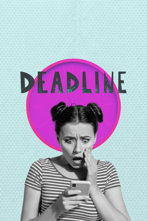 Collage of busy person with book laptop smartphone scissors tablet clock symbolizing deadline pressure in work and study