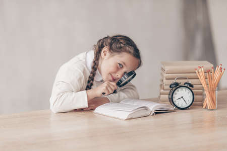 Home task, back to school concept. Girl sits at desk
