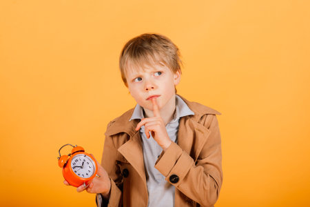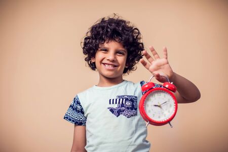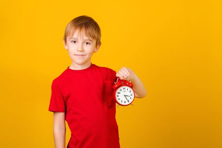A portrait of kid boy holding red alarm clock. Children and time management concept