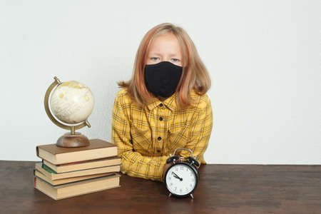Education concept. A schoolgirl in a protective mask looks at the camera. There are books on the table, a globe and an alarm clock.
