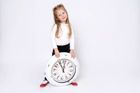 Children concept. The girl stands and holds a large white clock near her feet. Isolated over white background.