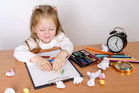 Education and kids concept. The girl sits at the table and draws. Isolated over white background.