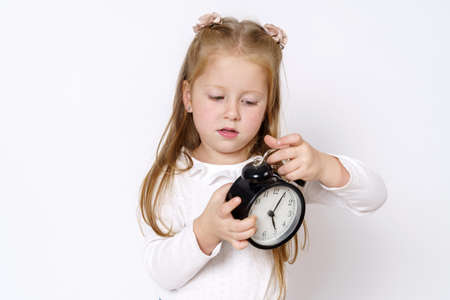 Children concept. A girl holds an alarm clock in her hands, plays with it. Isolated over white background.