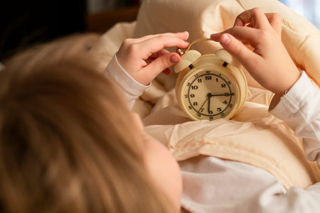Girl, female child holding an alarm clock in her hands close-up in the bed. Early morning