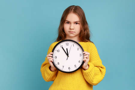 Portrait of little girl holding big wall clock in hands, looking at camera with serious expression, wearing yellow casual style sweater. Indoor studio shot isolated on blue background.