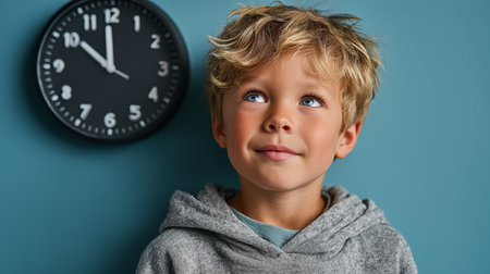 Portrait of a little boy on a blue background with a clock