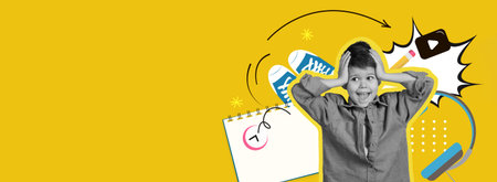 Young child student with ringing alarm clock is lazy going to school. Yellow background.