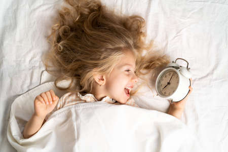 happy little blonde girl in a white bed with an alarm clock, good morning