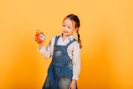 Isolated on yellow, attractive caucasian child in jeans with long bright hair hold the alarm clock
