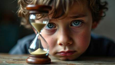 A young boy with striking blue eyes stars intently at an hourglass, conveying a thoughtful or contemplative expression. The scene emphasizes the notion of time and childhood curiosity.