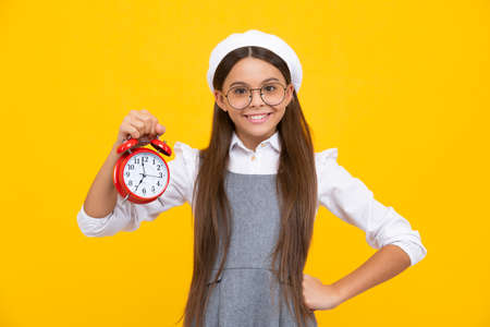 Surprised funny teenager girl child hold clock isolated on yellow studio background. Teenager child with alarm clock showing time.