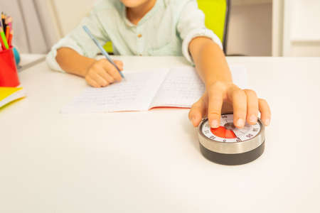 Little autistic boy hold lesson timer with hand while doing writing exercise, understanding time