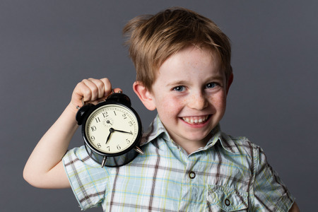 cheerful little boy with red hair and freckles enjoying showing an alarm clock for playful time concept and youth, grey background