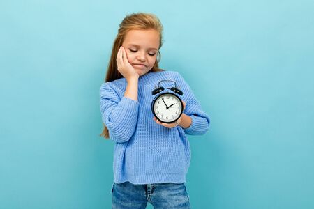 European girl looks at an alarm clock on a light blue wall.
