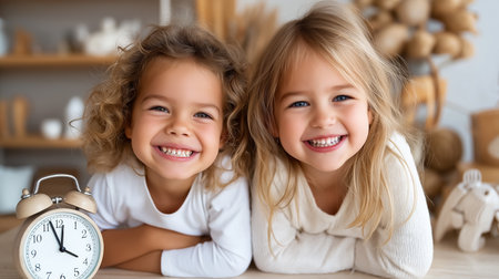 Two cheerful girls looking at the camera while smiling widely. Bright, cozy room with wooden decor. Concept of childhood, friendship, family bonding.