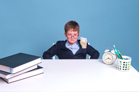 Boy student at school desk with euro money in his pocket, blue background