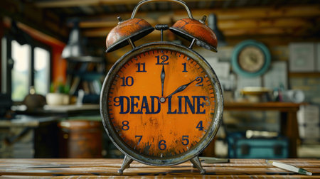 Vintage alarm clock on cluttered table in workshop, hands pointing to Deadline