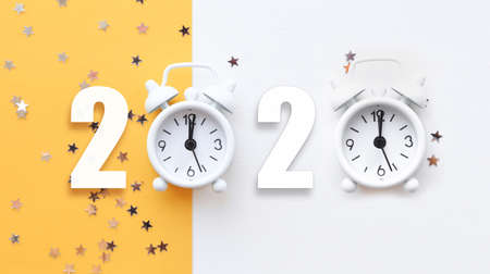 new goals for 2020. Composition flat lay. alarm clock on yellow background.