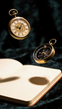 Pocket watch and brass compass float above an open lined notebook with a blurred dark backdrop, the blank page providing available space for text and design, while warm metallic tones suggest vintage travel and time themes