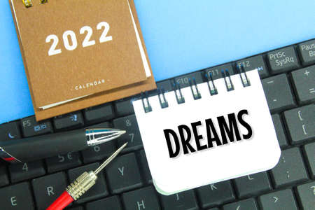 2022 calendar, laptop keyboard, pen, arrows and notebook with dream words