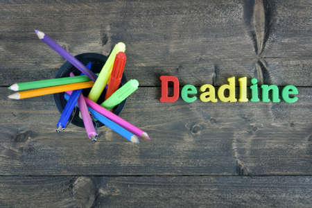 Deadline text on piece of paper, alarm clock and monthly calendar on the desk. White card with Deadline text and last date of month with dart pin on calendar date. Last day, Last chance concepts