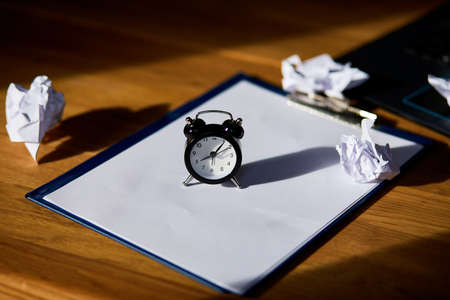Modern workplace, wooden office desk in hardlight, sunligt with clock, sheet of paper, laptop, notebook, crumpled paper balls, Change Your Mindset, plan B, time to set new goals, business and personal plans