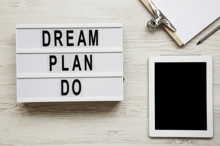 Modern board with text 'Dream plan do', clipboard, pencil and tablet over white wooden background, top view. From above, flat lay, overhead.