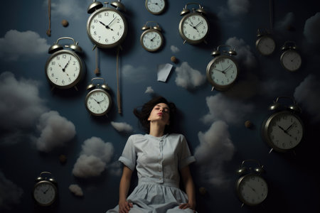 Illustration of a woman sitting on her bed who can't sleep. A wall covered with numerous alarm clocks