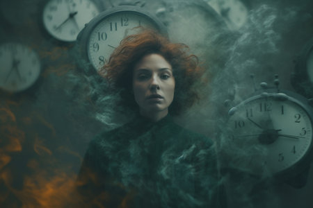 Time. An irreversible current flowing in only one direction, from past, through present to the future. Hourglass, seconds, clock, abstract eternity. Disappears and falls into oblivion. Generative AI.