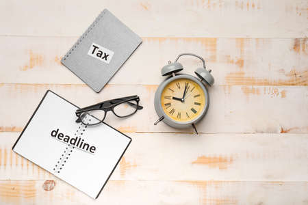 Alarm clock with notebooks and text TAX DEADLINE on white wooden background