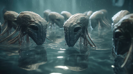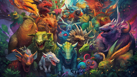Background of many strange creatures. AI generative.