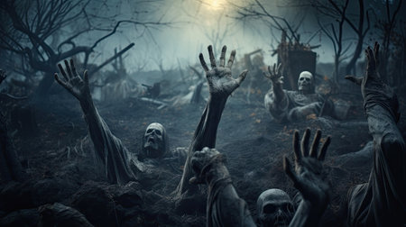 Bloodthirsty zombies in the cemetery. Halloween. Horror film.