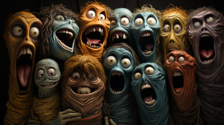A lively gathering of animated figures, adorned with colorful masks and painted in vibrant hues, stand frozen in a moment of shock and awe, their mouths agape in wonderment