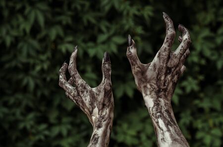 Horror and Halloween theme: Terrible zombie hands dirty with black nails reaches for green leaves, walking dead apocalypse, first-person view studio
