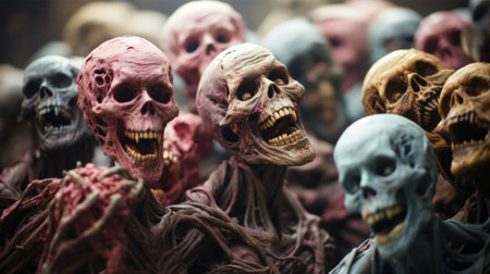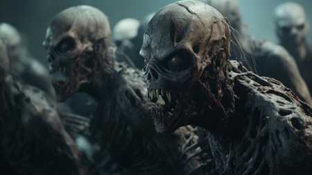 A group of zombies with glowing eyes and sharp teeth. Generative AI image.