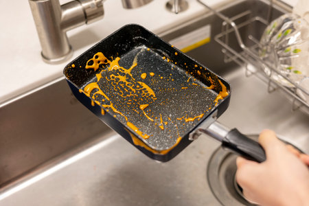 The dirty frying pan is being washed in the kitchen sink
