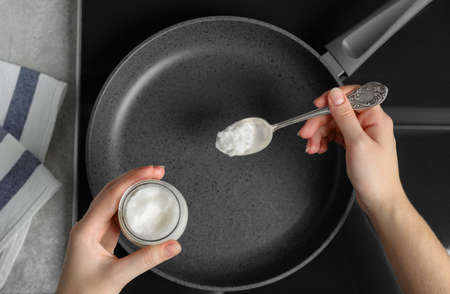 Woman cooking with coconut oil on induction stove, top view