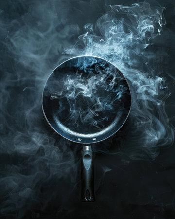 Frying pan with smoke on a black background.