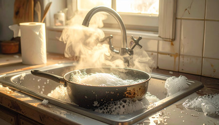 A cluttered kitchen scene revealing the challenges of meal preparation. Dirty dishes and a stained frying pan reflect chaotic cooking experiences at home.
