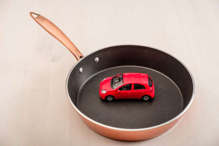 red toy car in a non-stick frying pan. hot sale concept