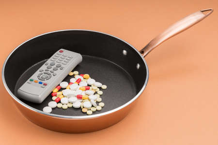 tablets and remote in a frying pan. all a person needs, viewing and medications