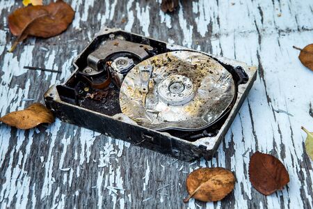 Crushed Hard Disk Drive on the Old Wooden Table outdoor