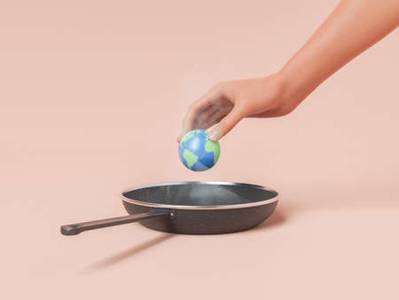 Hand holding small planet Earth over black metal steaming hot frying pan representing dangerous global warming on clear light background. 3d rendering